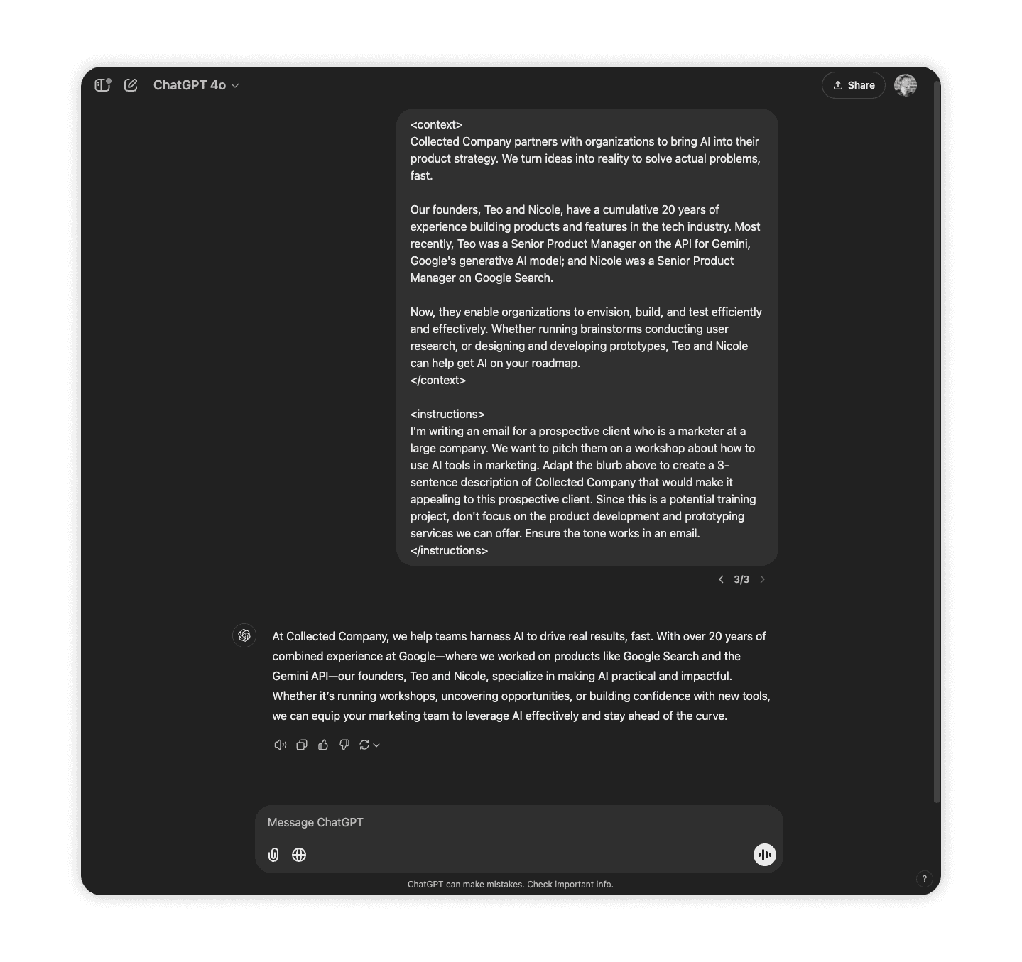 We figured we could use AI to jumpstart the document-writing, allowing us to keep our energy and creativity for the live conversations and ideation. Now, our process involves recording and auto-transcribing our conversation, and then using language models to generate a first draft.